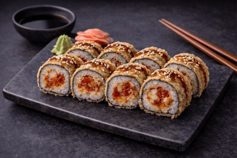 Vegetarisk fritert rull , med grønn saus, cheddarost, japansk omelett, tomat og avokado. Toppet med grønn saus, unagisaus og sesamfrø.