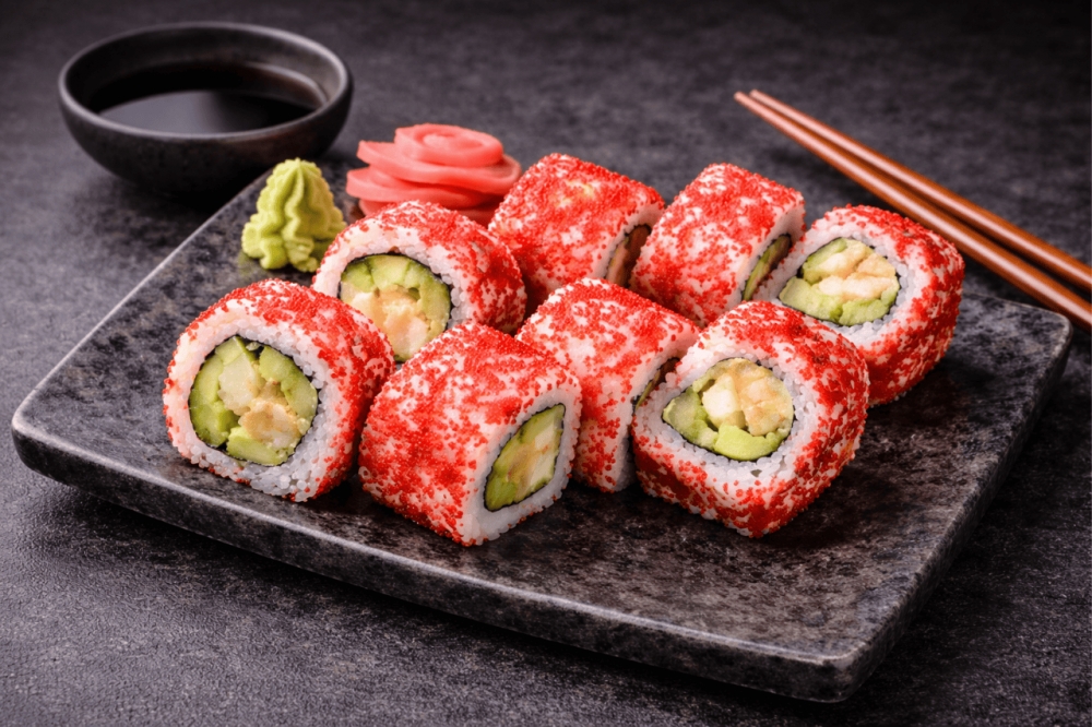 Sushi-rull med rogn, søt torsk, majones og saftige grønnsaker 8 biter